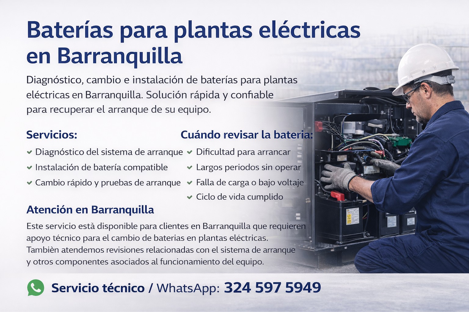 Este servicio está disponible para clientes en Barranquilla que requieren apoyo técnico para el cambio de baterías en plantas eléctricas. También atendemos revisiones relacionadas con el sistema de arranque y otros componentes asociados al funcionamiento del equipo.