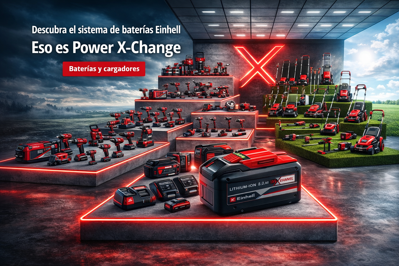 - Herramientas inalámbricas Einhell con plataformas de batería para mayor movilidad (baterías y cargadores según configuración).